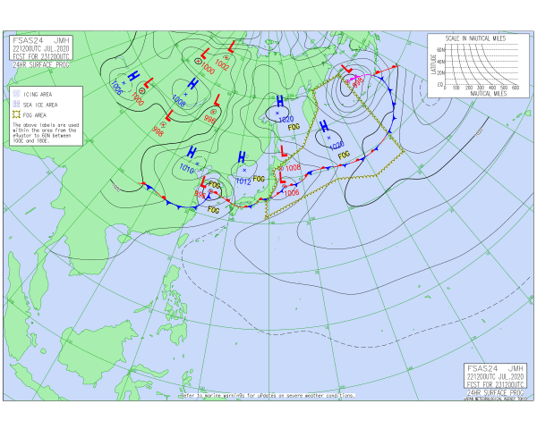 「2020.07.23.9:00のアジア太平洋域予想天気図」気象庁HPより
