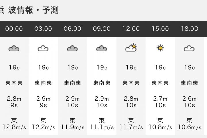 うねり:東南東2.9m(10.0s)、風:東11.9m/s