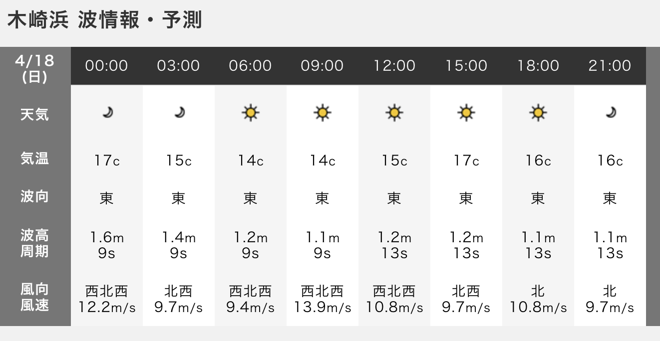 うねり:西北西1.8m(7.0s)、風:北西8.9m/s