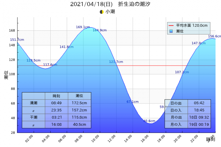 小潮:干潮 6:04(86.2cm),19:18(59.4cm)、満潮 12:20(167.9cm)