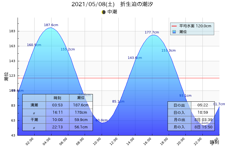大潮:満潮 5:18(177.4cm),18:04(175.5cm)、干潮 11:35(31.6cm),23:48(67.9cm)