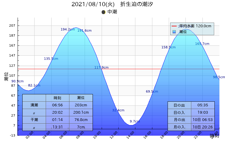 中潮 干潮 1:14(76.8cm),13:31(7.0cm)、満潮 6:56(203.0cm),20:02(200.1cm)