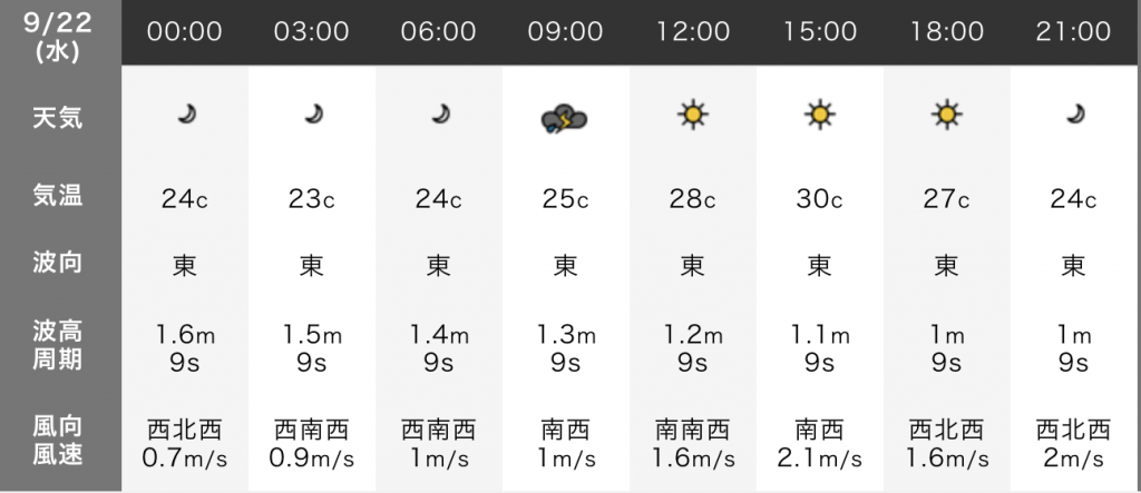 うねり:西0.6m(6.7s)、風:西6.0m/s