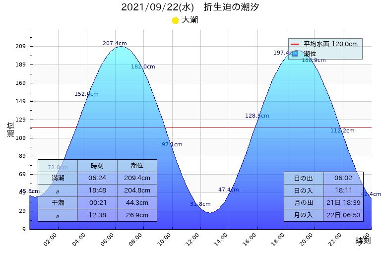 大潮 満潮 6:24(209.4cm),18:48(204.8cm)、干潮 12:38(26.9cm)