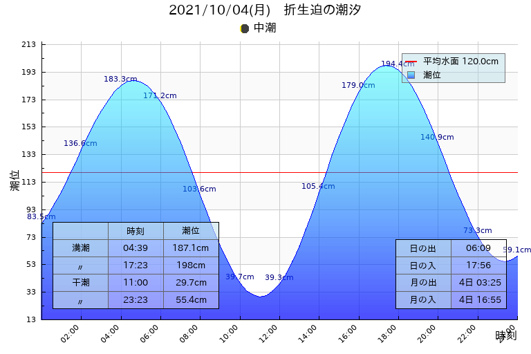 中潮 満潮 04:39(187.1cm),17:23(198.0cm)、干潮 11:00(29.7cm),23:23(55.4cm)