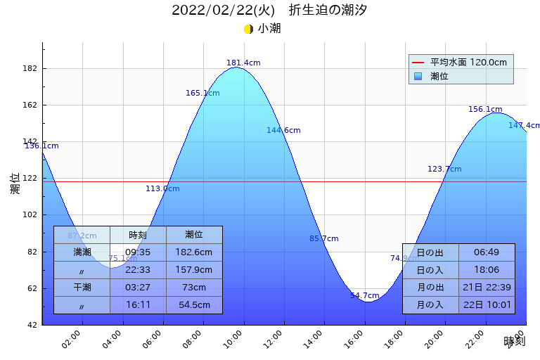 小潮 干潮 3:27(73.0cm),16:11(54.5cm)、満潮 9:35(182.6cm),22:33(157.9cm)