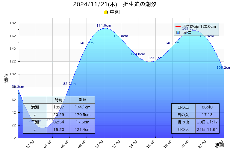 中潮 干潮 02:54(17.6sm),15:20(121.4cm) 、満潮 10:07(174.1cm),20:29(170.5cm)
