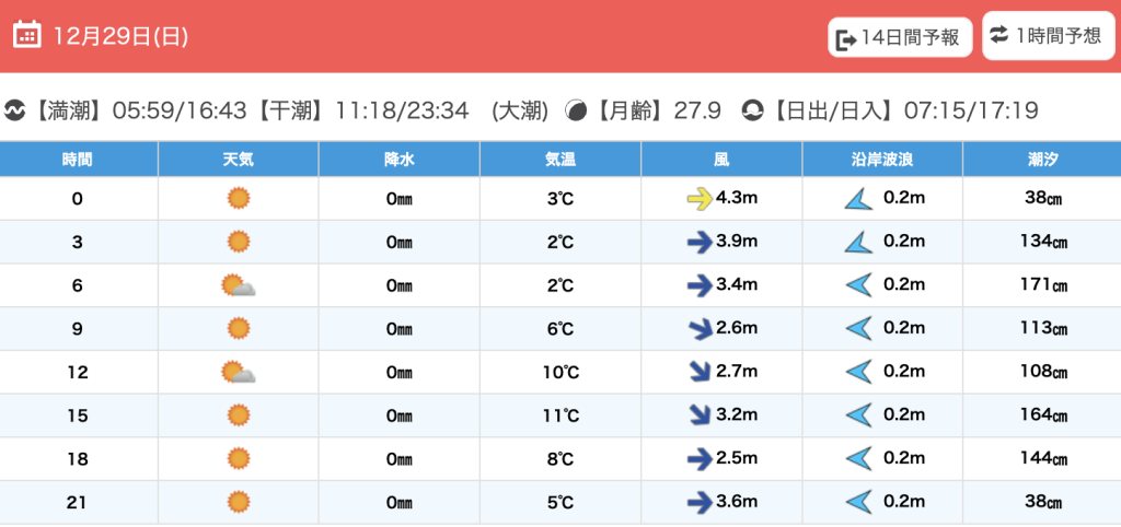 大潮 満潮 06:38(192.5cm),17:17(195.7cm)、干潮 11:56(109.9cm)