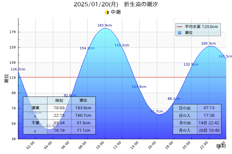 中潮 干潮 03:34(51.5cm),16:19(71.1cm)、満潮 10:03(183.9cm),22:15(160.7cm)