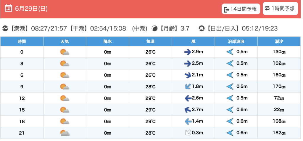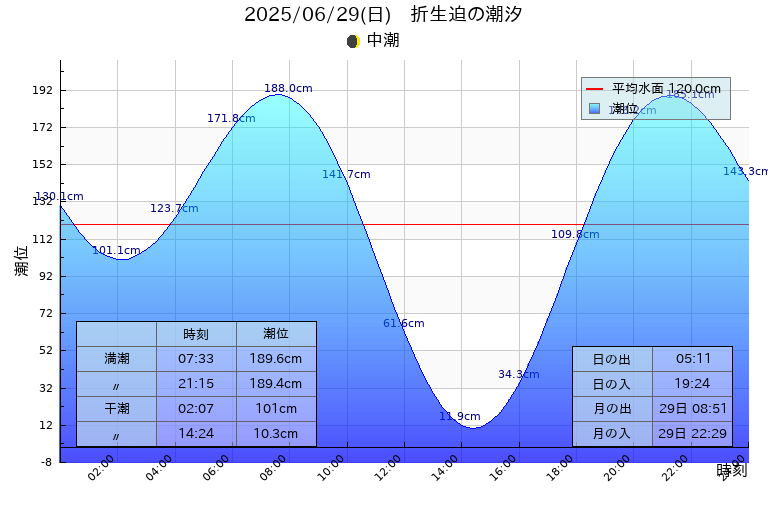中潮:干潮 02:07(101.0cm),14:24(10.3cm)、満潮 07:33(189.5cm),21:15(189.4cm)