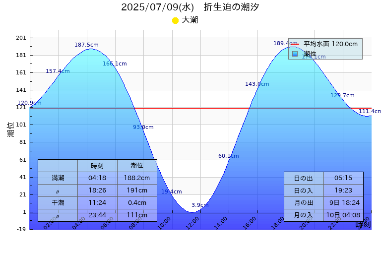 大潮:満潮 04:18(188.2cm),18:26(191.0cm)、干潮 11:24(9.4cm),23:44(111.0cm)