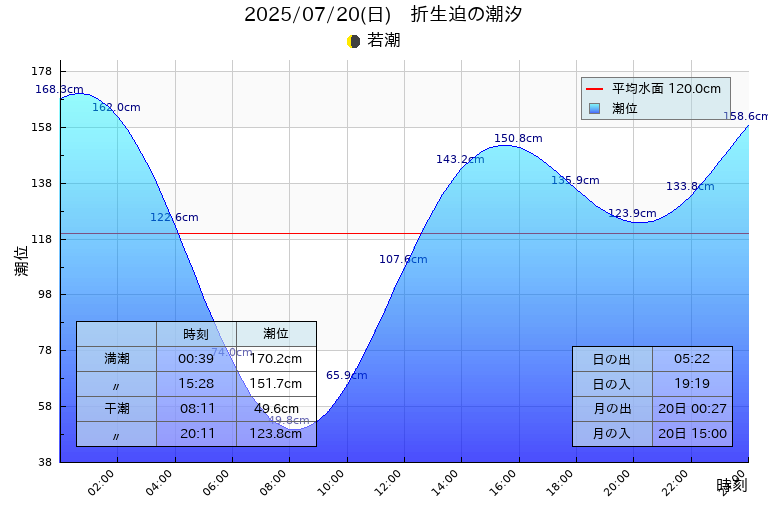 若潮:満潮 00:39(170.2cm),15:28(151.7cm)、干潮 08:11(49.6cm),20:11(123.8cm)