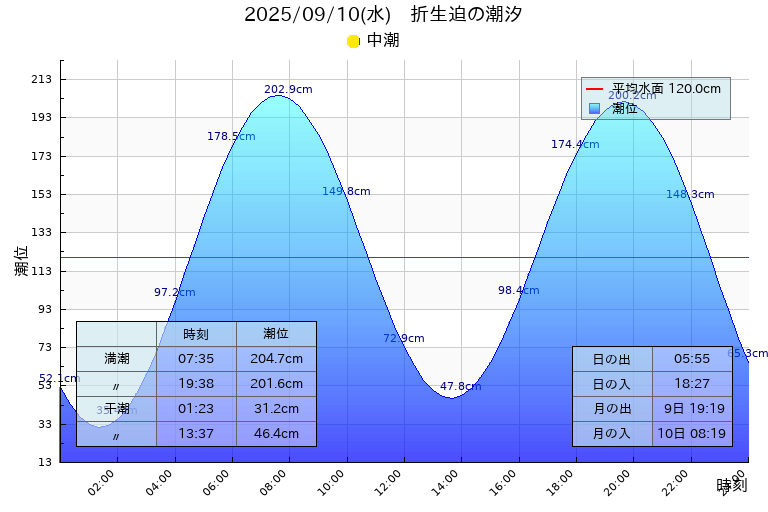 中潮:干潮 01:23(31.2cm),13:37(46.4cm)、満潮 07:35(204.7cm),19:38(201.6cm)