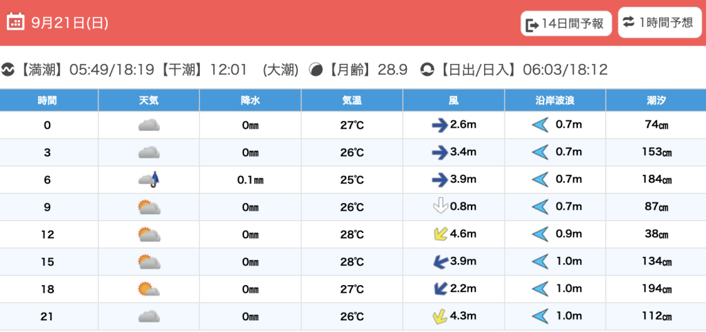 大潮:満潮 05:16(198.8cm),17:53(200.7cm)、干潮 11:36(25.2cm),23:52(46.3cm)