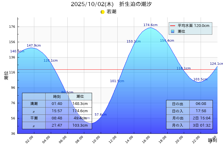 若潮:満潮 01:40(148.3cm),15:57(174.6cm)、干潮 08:48(49.4cm),21:47(103.3cm)