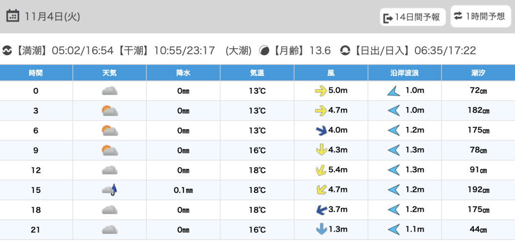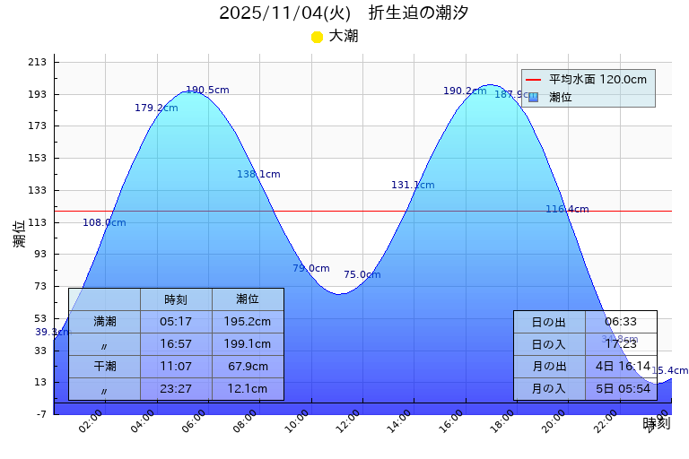 大潮:満潮 05:17(195.2cm),16:57(199.1cm)、干潮 11:07(67.9cm),23:27(12.1cm)