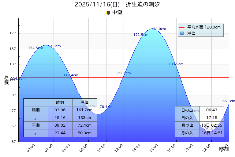 中潮:満潮 03:06(161.7sm),15:16(183.0cm)、干潮 09:02(72.4cm),21:44(50.3cm)