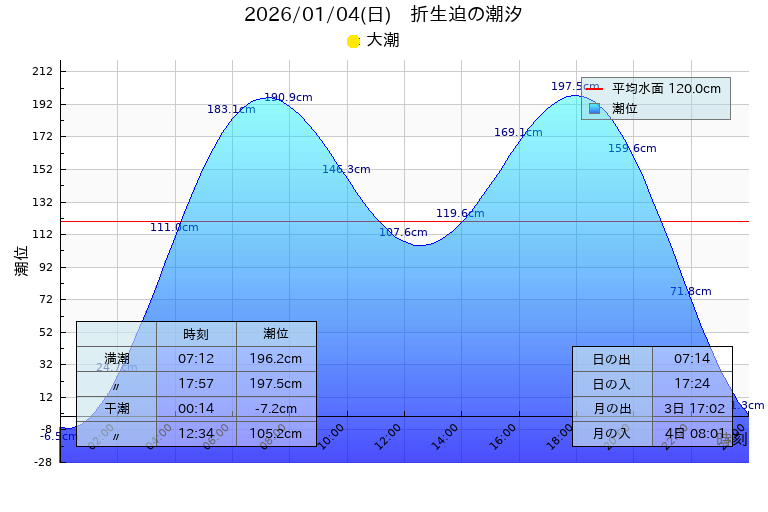 大潮:干潮 00:14(-7.2cm),12:34(105.2cm)、満潮 07:12(196.2cm),17:57(197.5cm)