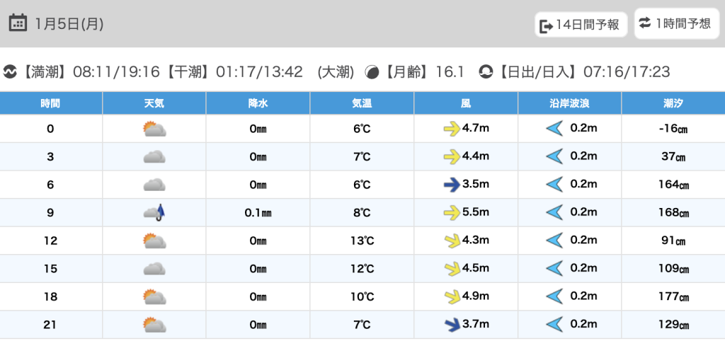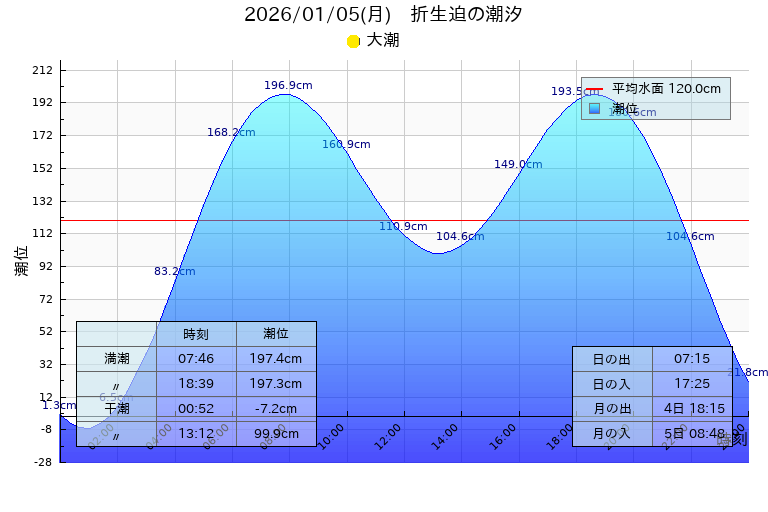 大潮:干潮 00:14(-7.2cm),12:34(105.2cm)、満潮 07:12(196.2cm),17:57(197.5cm)