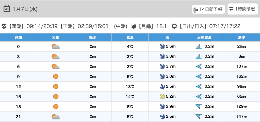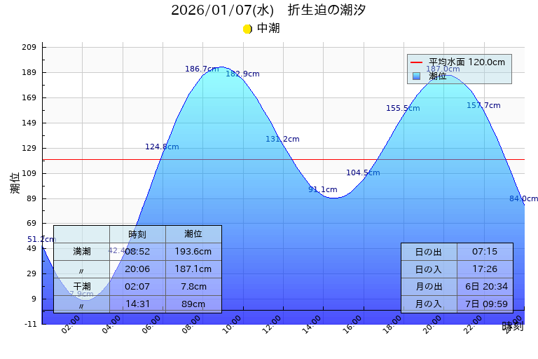 中潮:干潮 02:07(7.28cm),14:31(89.0cm)、満潮 08:52(193.6cm),20:06(187.1cm)