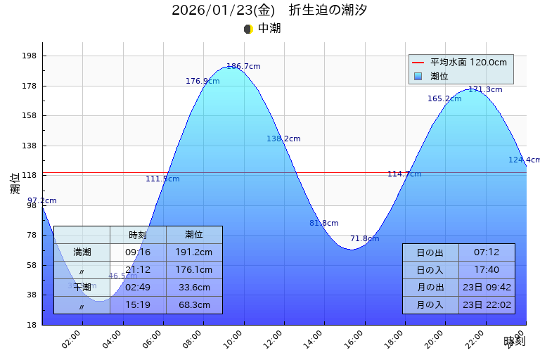 中潮:干潮 02:49(33.6cm),15:19(68.3cm)、満潮 09:16(191.2cm),21:12(176.1cm)