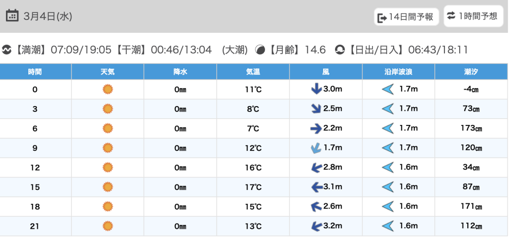 潮汐:大潮 干潮 00:17(14.0cm),12:31(52.0cm)、満潮 06:38(203.0cm),18:29(209.2cm)