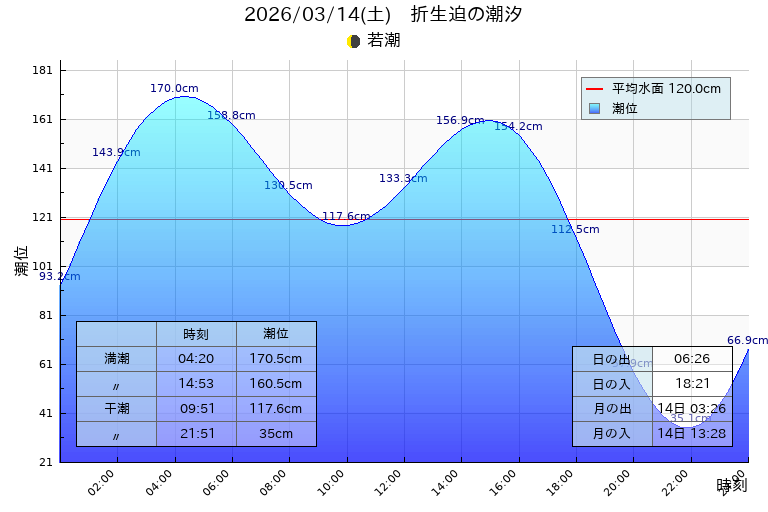 潮汐:若潮 満潮 04:20(170.5cm),14:53(160.5cm)、干潮 09:51(117.6cm),21:51(35.0cm)