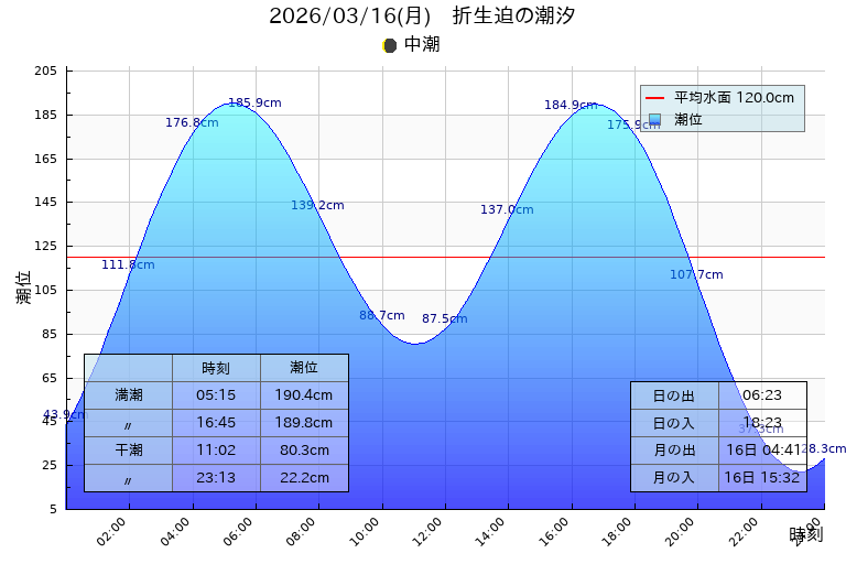 潮汐:中潮 満潮 05:15(190.4cm),16:45(189.8cm)、干潮 11:02(80.3cm),23:13(22.2cm)