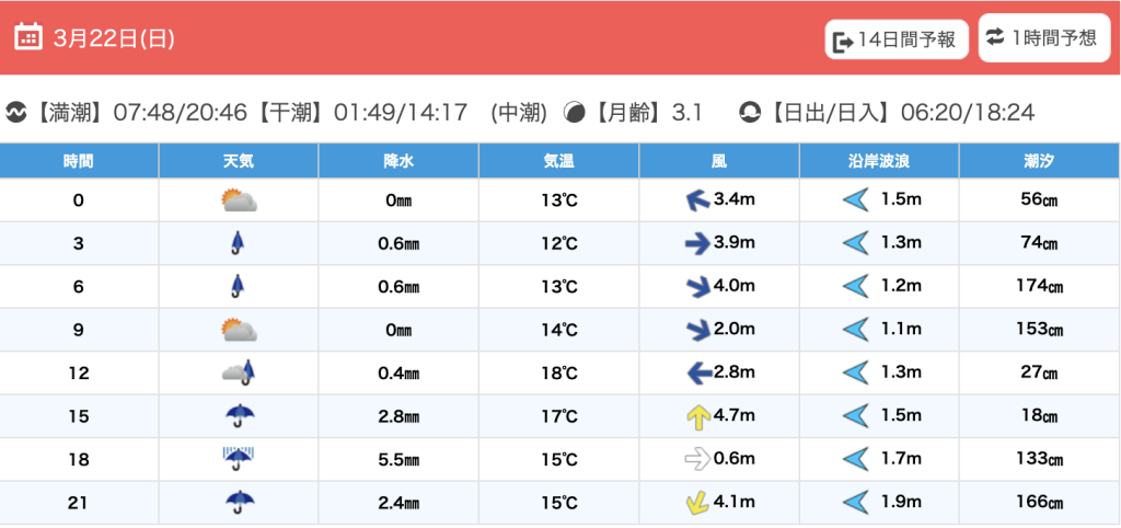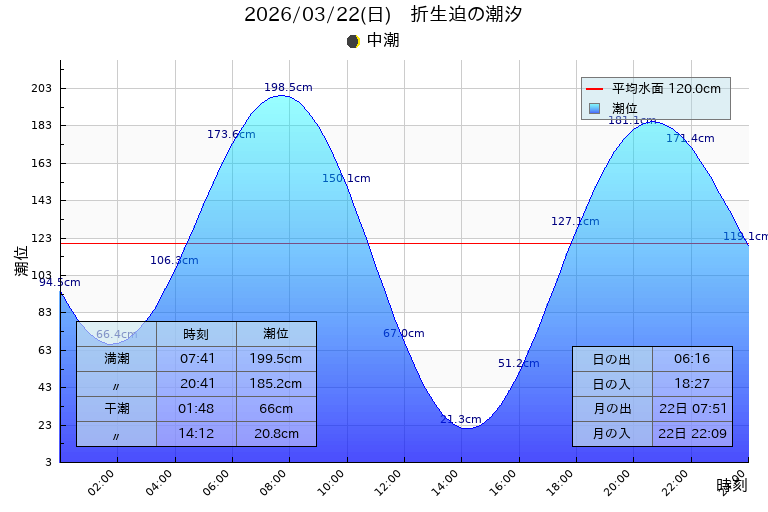 潮汐:中潮 干潮 01:48(66.0cm),14:12(20.6cm)、満潮 07:41(199.5cm),20:41(185.2cm)