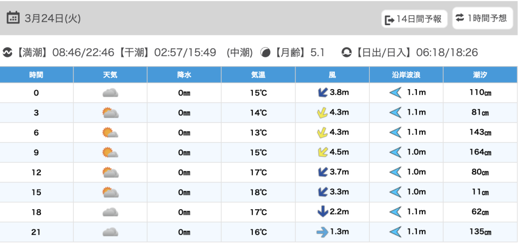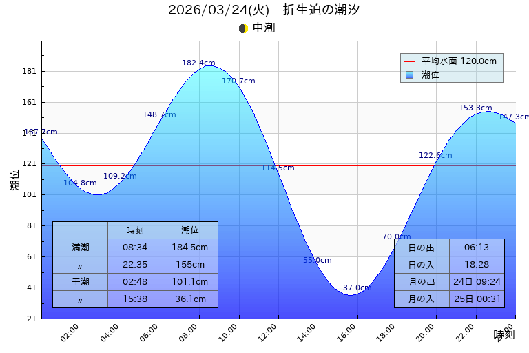 潮汐:中潮 干潮 02:48(101.1cm),15:35(36.1cm)、満潮 08:34(184.5cm),22:35(155.0cm)
