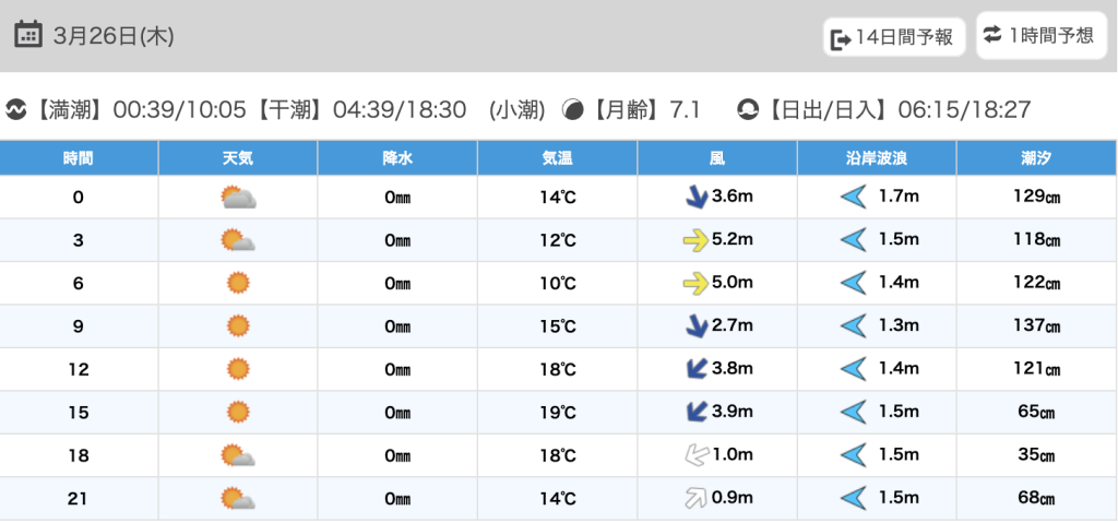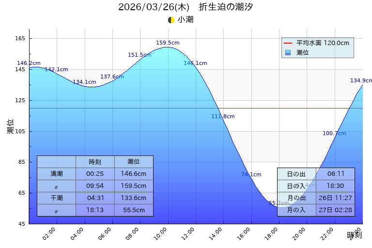 潮汐:小潮 満潮 00:25(146.6cm),09:54(159.5cm)、干潮 04:31(133.6cm),18:13(55.5cm)