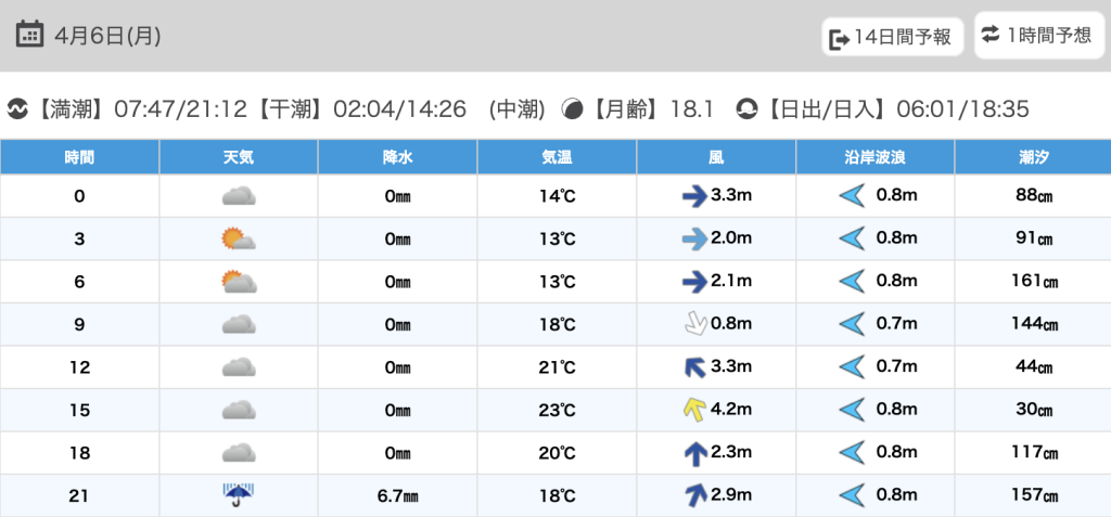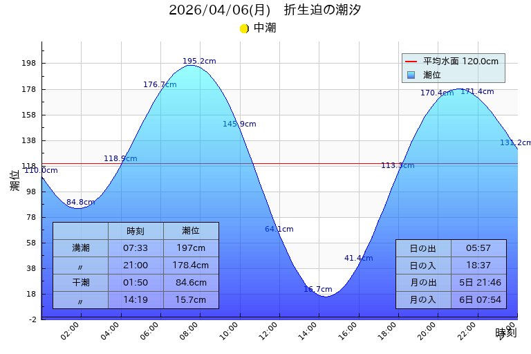 潮汐:中潮 干潮 01:50(84.6cm),14:19(15.7cm)、満潮 07:33(197.0cm),21:00(178.4cm)