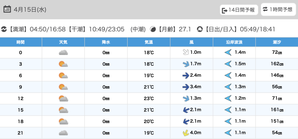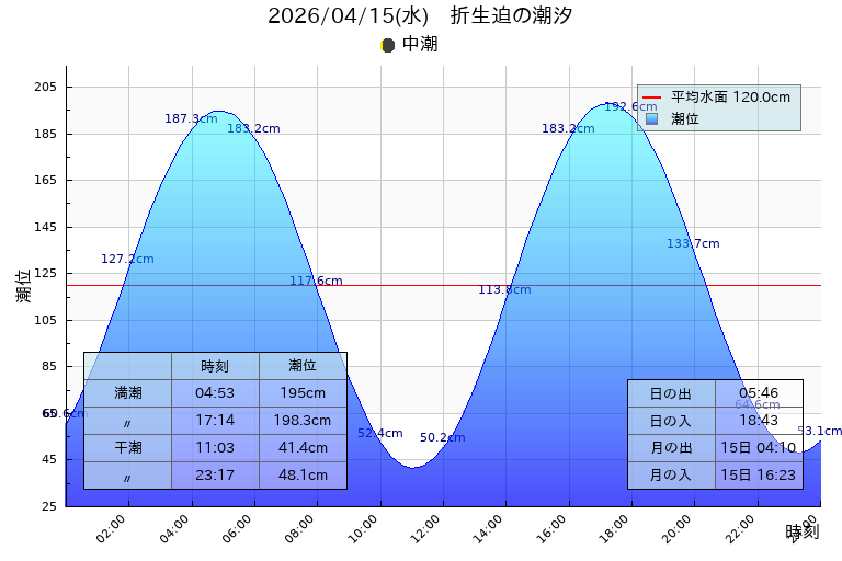 潮汐:中潮 満潮 04:53(195.0cm),17:14(196.3cm)、干潮 11:03(41.4cm),23:17(48.1cm)