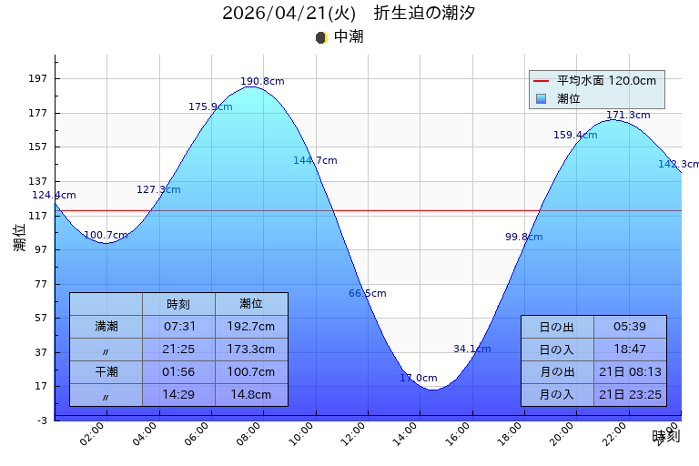 潮汐:中潮 干潮 01:56(100.7cm),14:29(14.8cm)、満潮 07:31(192.7cm),21:25(173.3cm)