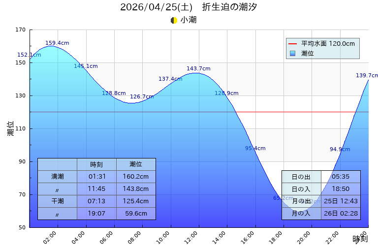 潮汐:小潮 満潮 01:31(160.2cm),11:45(143.8cm)、干潮 07:13(125.4cm),19:07(59.6cm)