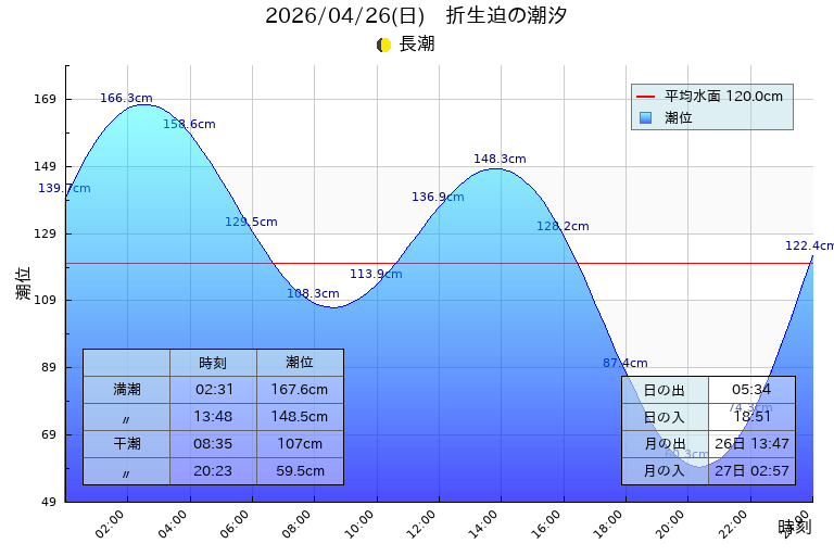 潮汐:長潮 満潮 02:31(167.6cm),13:48(148.5cm)、干潮 08:35(107.0cm),20:23(59.5cm)
