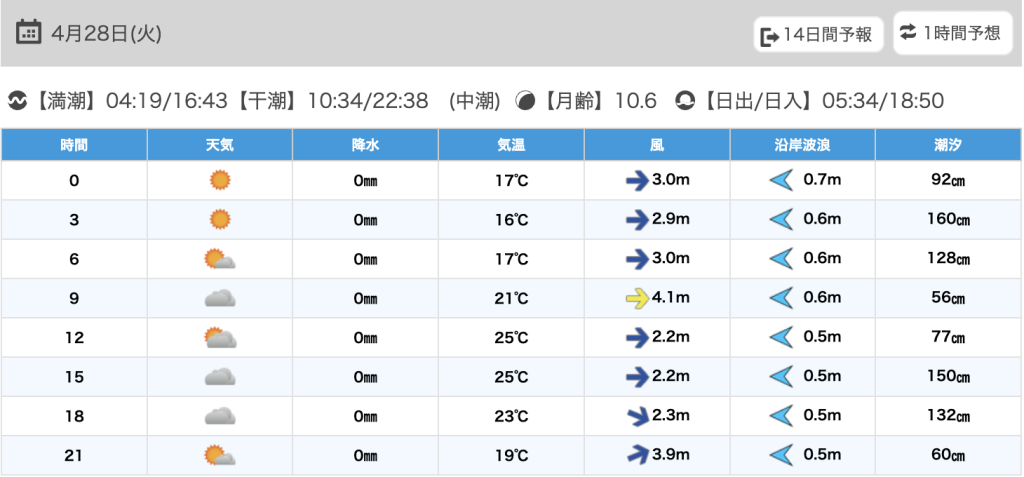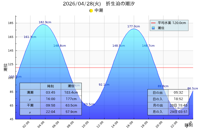 潮汐:中潮 満潮 03:45(183.4cm),16:00(177.0cm)、干潮 09:58(63.5cm),22:04(57.9cm)