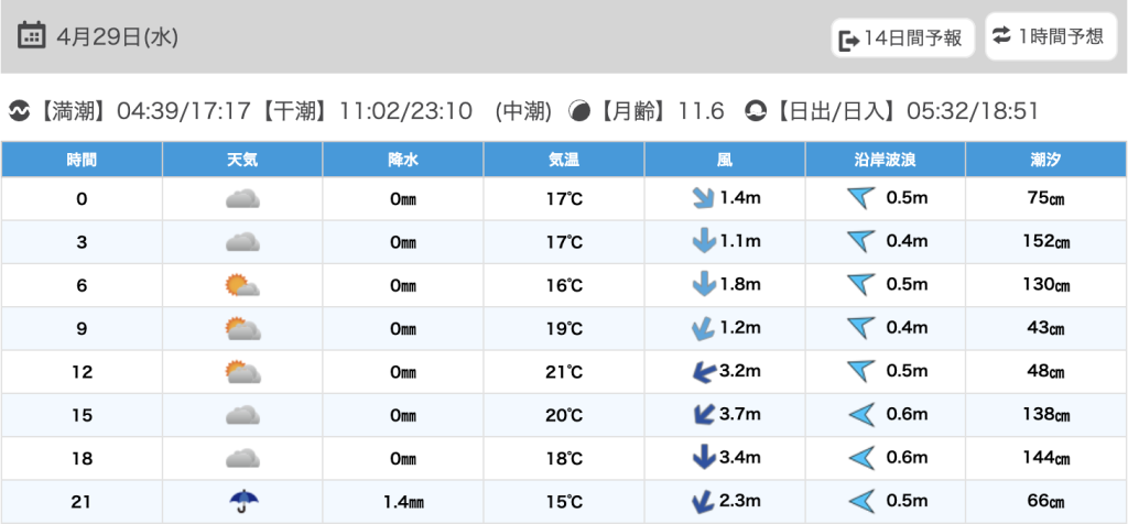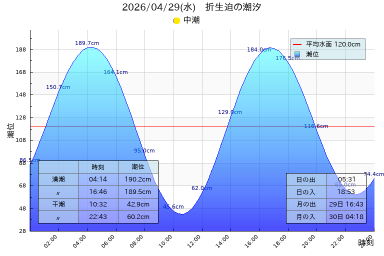 潮汐:中潮 満潮 04:14(190.2cm),16:46(189.5cm)、干潮 10:32(42.9cm),22:43(60.2cm)